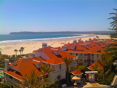 My husband went to Coronado recently to speak at a conference, and this was the view from his room at the Del. The low buildings in front are the new Villa units that are part of the Hotel Del Coronado complex. This is a view down Coronado beach. Across the sea is Point Loma, and the entrance to San Diego harbor is between Pt. Loma and the end of Coronado.